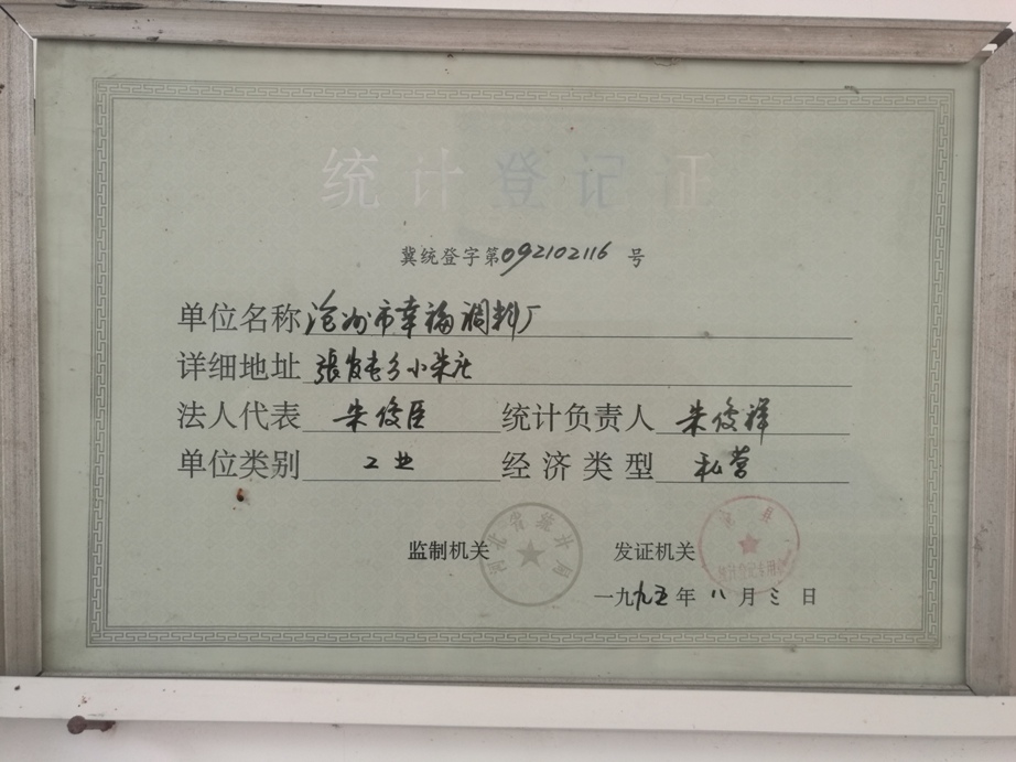 統(tǒng)計登記證 冀統(tǒng)登字第092102116號 單位名稱滄州市幸福調(diào)料廠 詳細(xì)地址張官屯鄉(xiāng)小朱莊 發(fā)證機(jī)關(guān):滄縣統(tǒng)計局 監(jiān)制機(jī)關(guān):河北省統(tǒng)計局 一九九五年八月三日